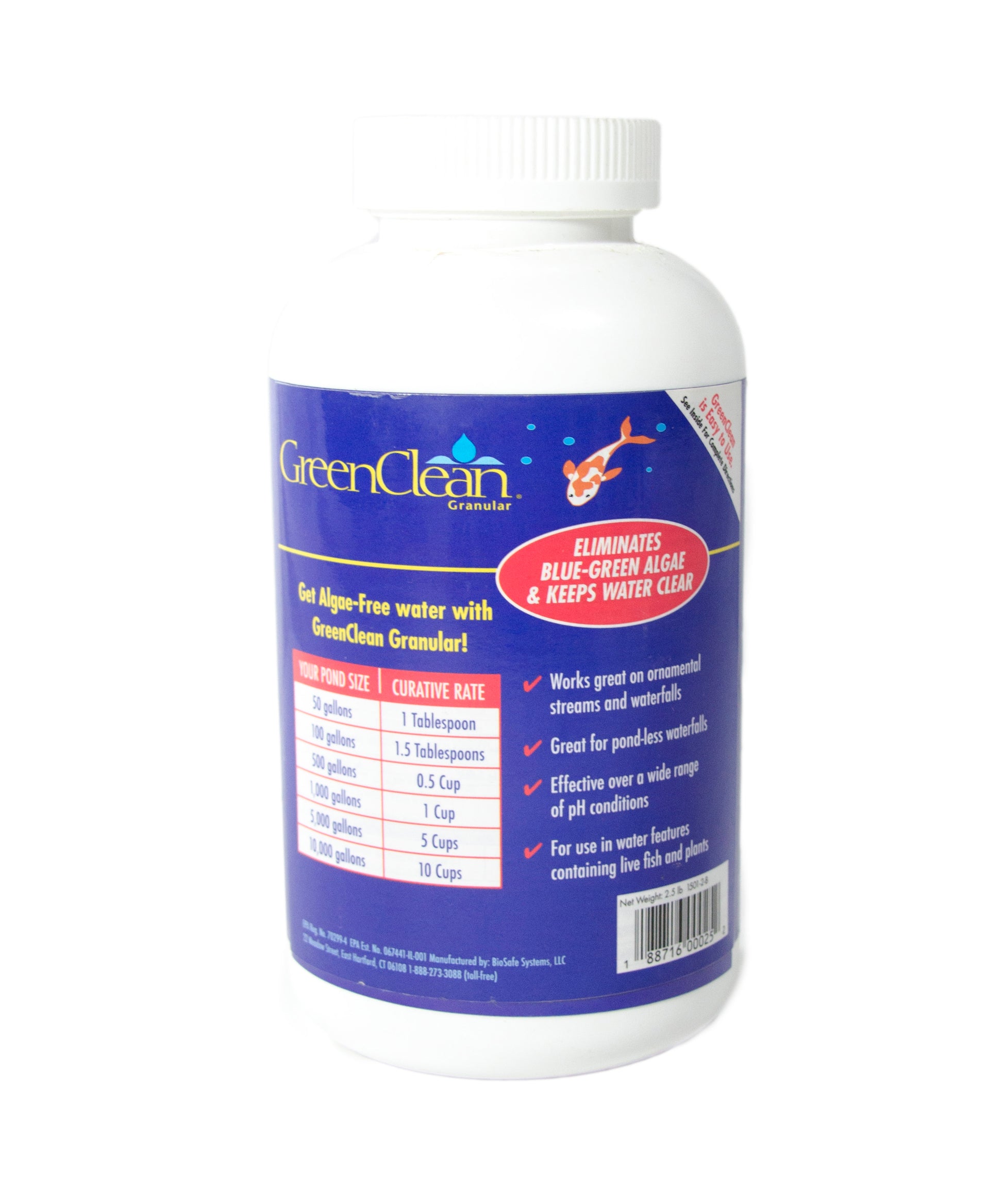 Eliminate a broad spectrum of algae on contact with this non-copper-based algaecide. Provides excellent algae control for ponds , fountains, and waterfalls, as well as for unpainted surfaces such as birdbaths, statues, and walkways. Its active ingredient creates a powerful oxidation reaction that quickly destroys algal cell membranes and chlorophyll, providing immediate control of algae. Fast- acting, Green Clean granular algaecide biodegrades completely and adds bio-available oxygen to the water. Green Clean works fast and gets rid of persistent algae problems.